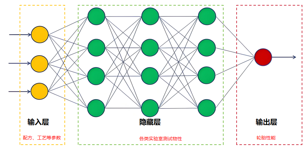 AI能发现传统方法难以识别的复杂关系,比如某种硫化剂用量的微小变化如何通过多级物性传递影响最终耐磨性(神经网络参数权重解析)。